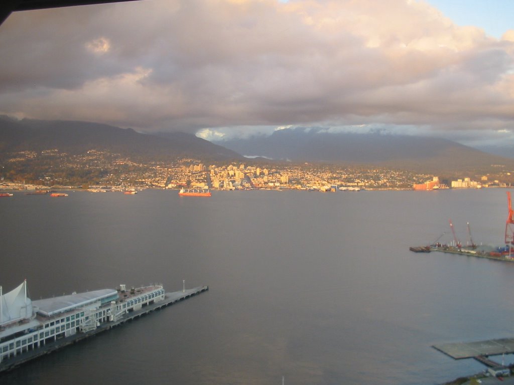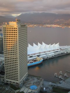 A Canada Place, a kikötő (jobbra fehér) és a világ legmagasabb légiforgalmi irányítótornya. (1 km-s körzetben található a hidroplán "kikötő" és a heliport is.
