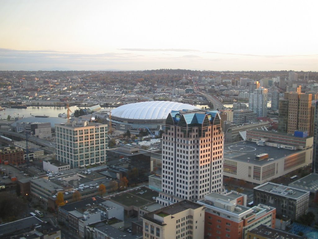 Miután degeszre ettük magunkat, ismét a kilátótorony felé vettük az irányt, egyelőre Zubi a személyes készpénzfelvevő automatám, miután egyelőre ez a legolcsóbb módja, hogy kanadai dollárhoz jussak, közös étel-italozásaink során én fizetek kártyával és ő ad nekem néha készpénzt ha szükségem van rá, például ha busszal kezdem az utazásomat, vagy - mint a mellékelt ábra is mutatja - fel akarok menni a kilátóba. Sikeresen megváltottam a diákjegyet és nekiálltam fényképezni odafönt, s közben érdekesbbnél érdekesebb dolgokat olvashattam az ablak alatt elhelyezett plasztikokon. Mivel elég rossz a memóriám, és a kilátó üzletét sem akarom rontani, csak a BC stadionról szóló szösszenetet idézném, miszerint a stadion tetőszerkezetét 16 légbefúvó által keltett túlnyomás tartja, ami méretéből adódóan meglepó megoldás, de szemmel láthatóan működik.