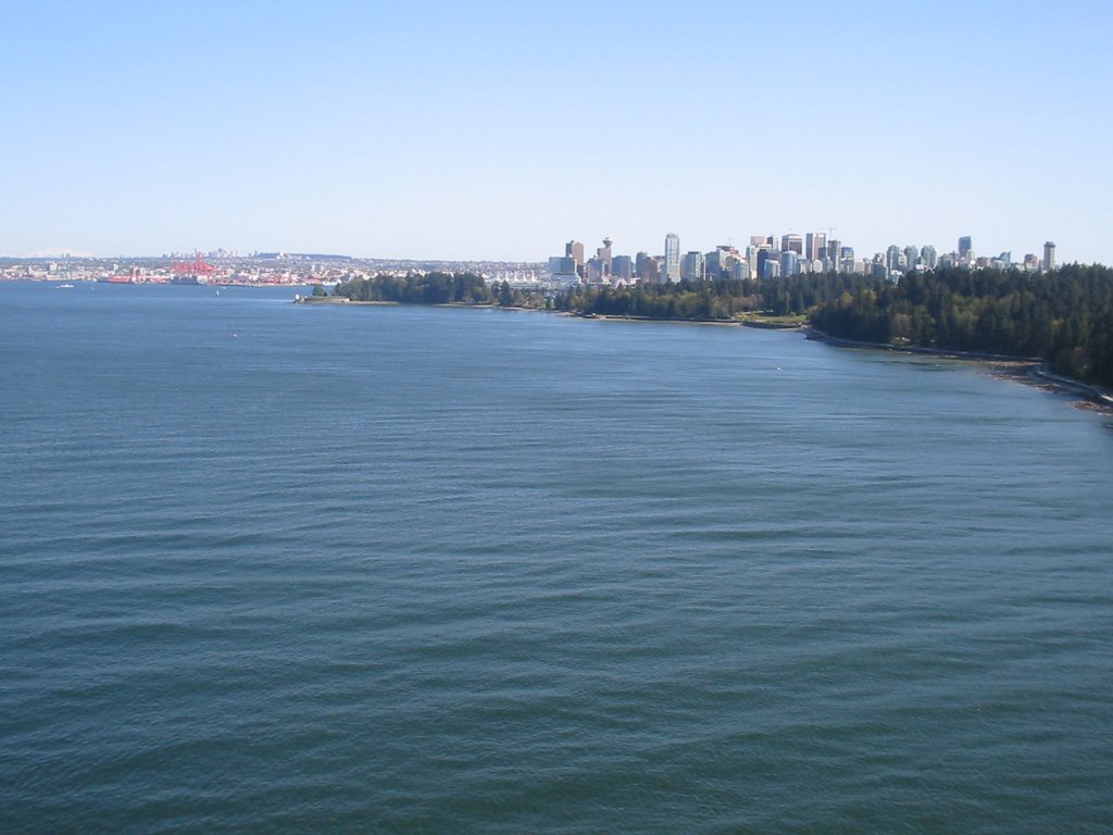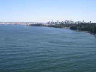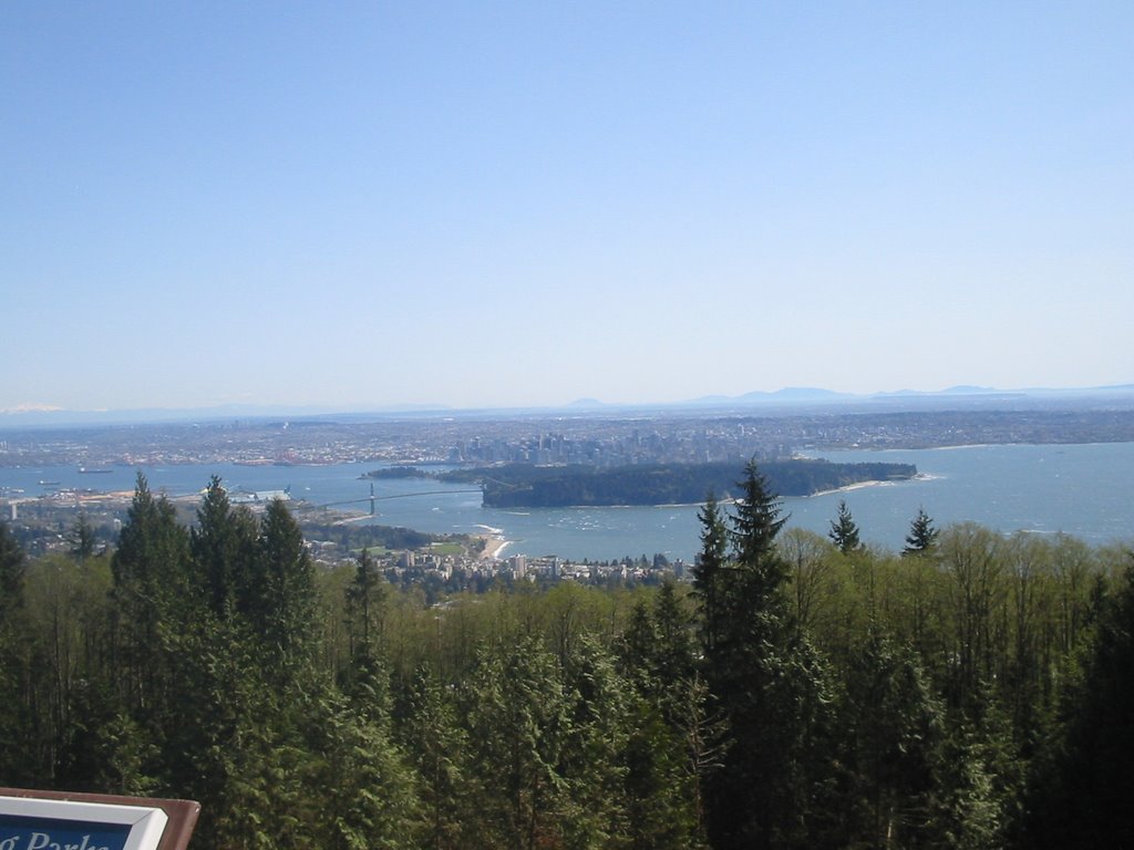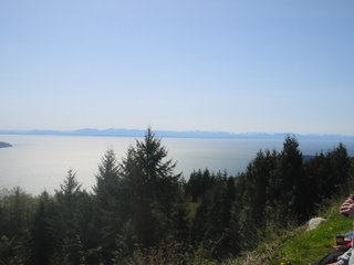 A célunk elérését az elénk táruló látvány koronázta meg, körülbelül 120 (!) kilométeres félkörben mindent láttunk ami a környéken látható. Innen például látszott a Baker-hegyet ami az Egyesült Államok területén található. Középpontban a Stanley park található, amit a Lions Gate híd köt össze Észak- és Nyugat Vancouver-rel. Balra nagyjából látszik a házunk is, a kikötő, illetve kicsit délebbre látszik Burnaby dombja, ahol Zubi lakik. Egészen nyugaton látszanak a Vancouvert a nyílt óceántól elválasztó szigeten található hegyek hófödte sipkái is. Sajnos nem tudok túl sokat rizsázni - nem mintha eddig nem ez lett volna - de tényleg lenyűgöző volt a látvány (most nagyon elragadtadtattam magam, de tényleg megérte feltekerni).