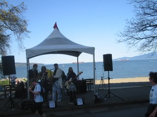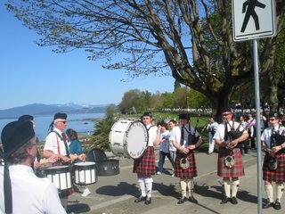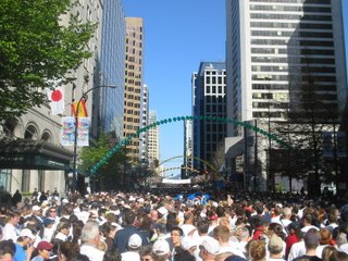 This year with record-beating 50746 registered runners, i took part in canadas biggest 10K run. Letting 50K people run in the same time in the same direction was successfully driven my Turkish troops in 1526 (yes, the hungarian "army" was running away) , but so far the world is more civilised (especially this corner) so we crossed the start-line in 2-3K batches, letting the faster runners first. I was waiting in a middle-rated group (white numbers) so 53 minutes after the start-shoot i crossed the start and was registered via my chip fastened to my shoe. By this time, the first fastest guy from Kenya had been waiting for the medal ceremony with a time 28:15 ... After passing the first kilometer, i stopped for taking photos several times, especially when i passed the bands playing along the route. Here are two of these bands